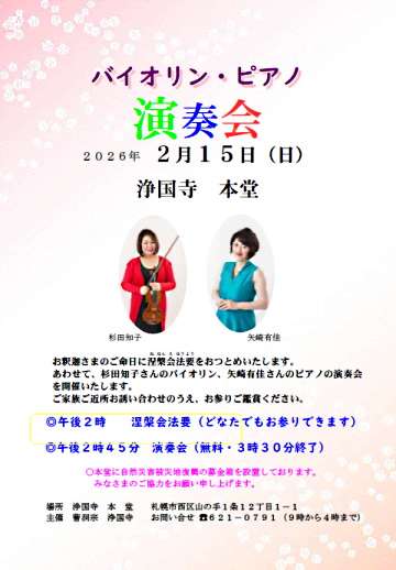 涅槃会は、お釈迦さまのご命日です。午後2時より本堂にて涅槃会法要を修行いたします。あわせて午後2時45分から、杉田知子さんのバイオリンと矢崎有佳さんのピアノによるミニコンサートを開催いたします。